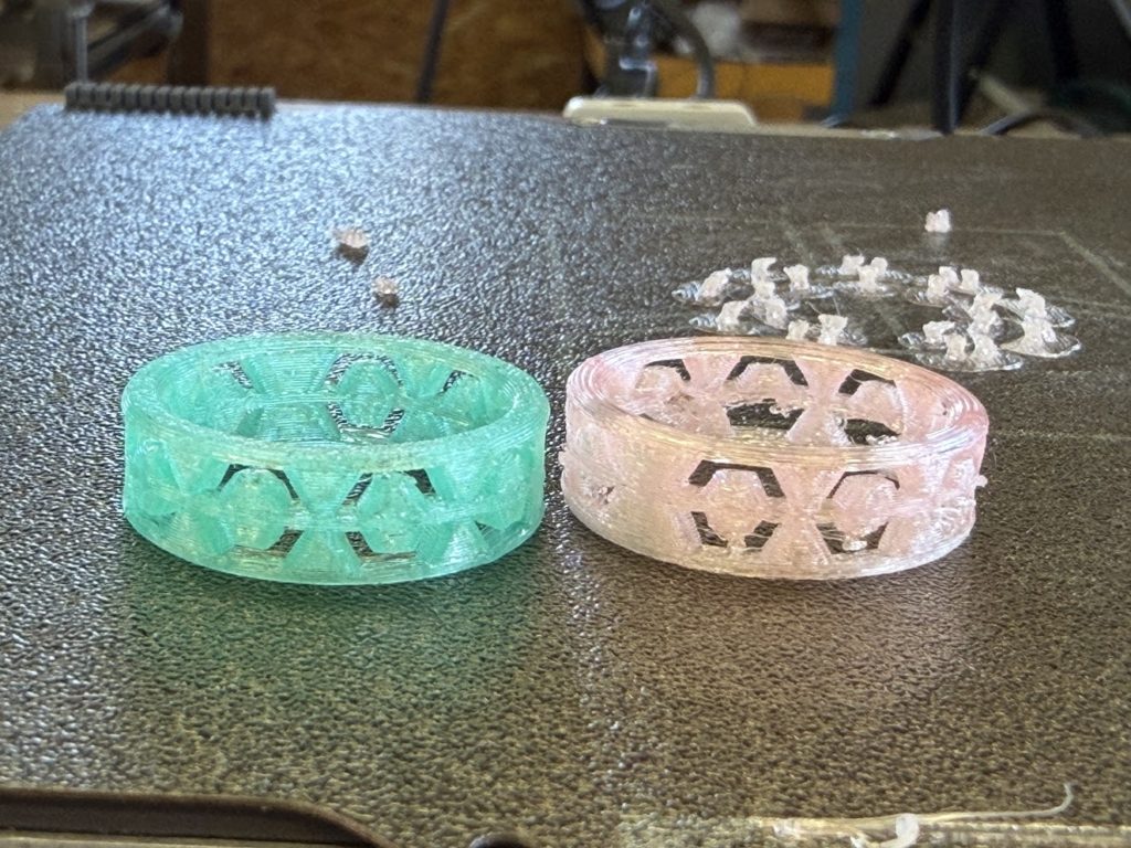 左は製品として販売しているPETG(ペットボトルと同じ素材)のフィラメントを使って同じ指輪のデータで3Dプリントしたものです。