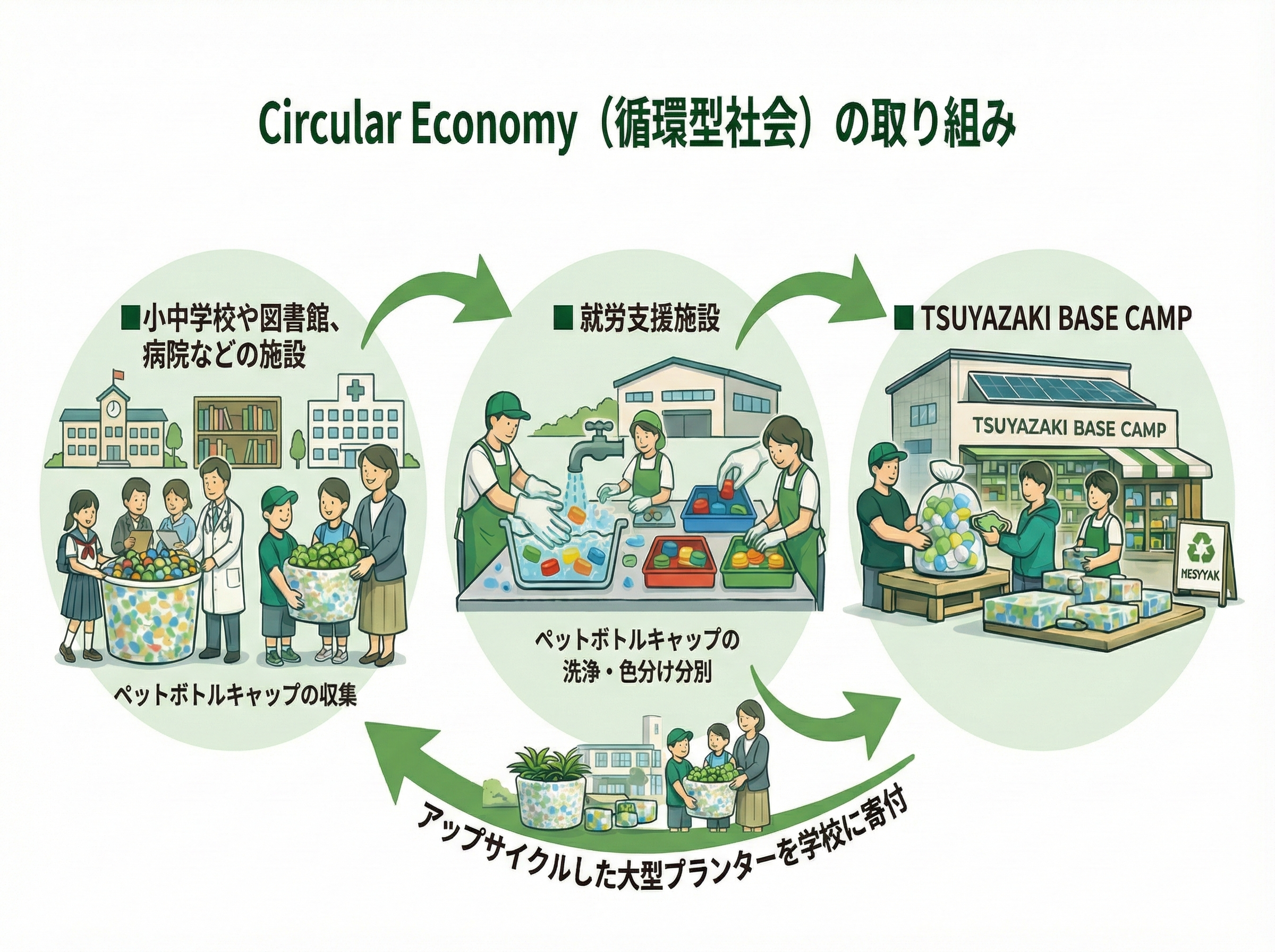 TSUYAZAKI BASE CAMPでは、地域の小学校や図書館、病院などの施設で回収したペットボトルキャップを①洗浄 ⇒ ②分別 ⇒ ③チップ化